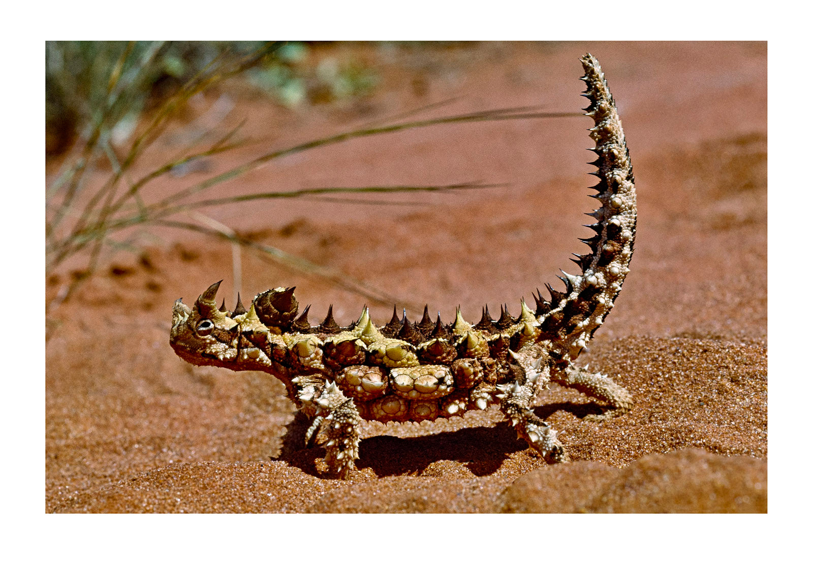 An Australian thorny devil with an erect tail moves across a sand dune South Australia.