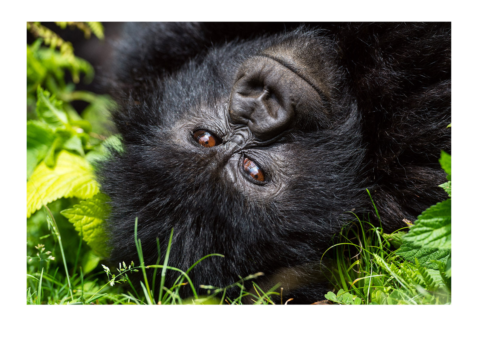 An endangered Mountain Gorilla, Gorilla beringei beringei, relaxing during the heat of the day with a smile. Volcanoes National Park, Rwanda