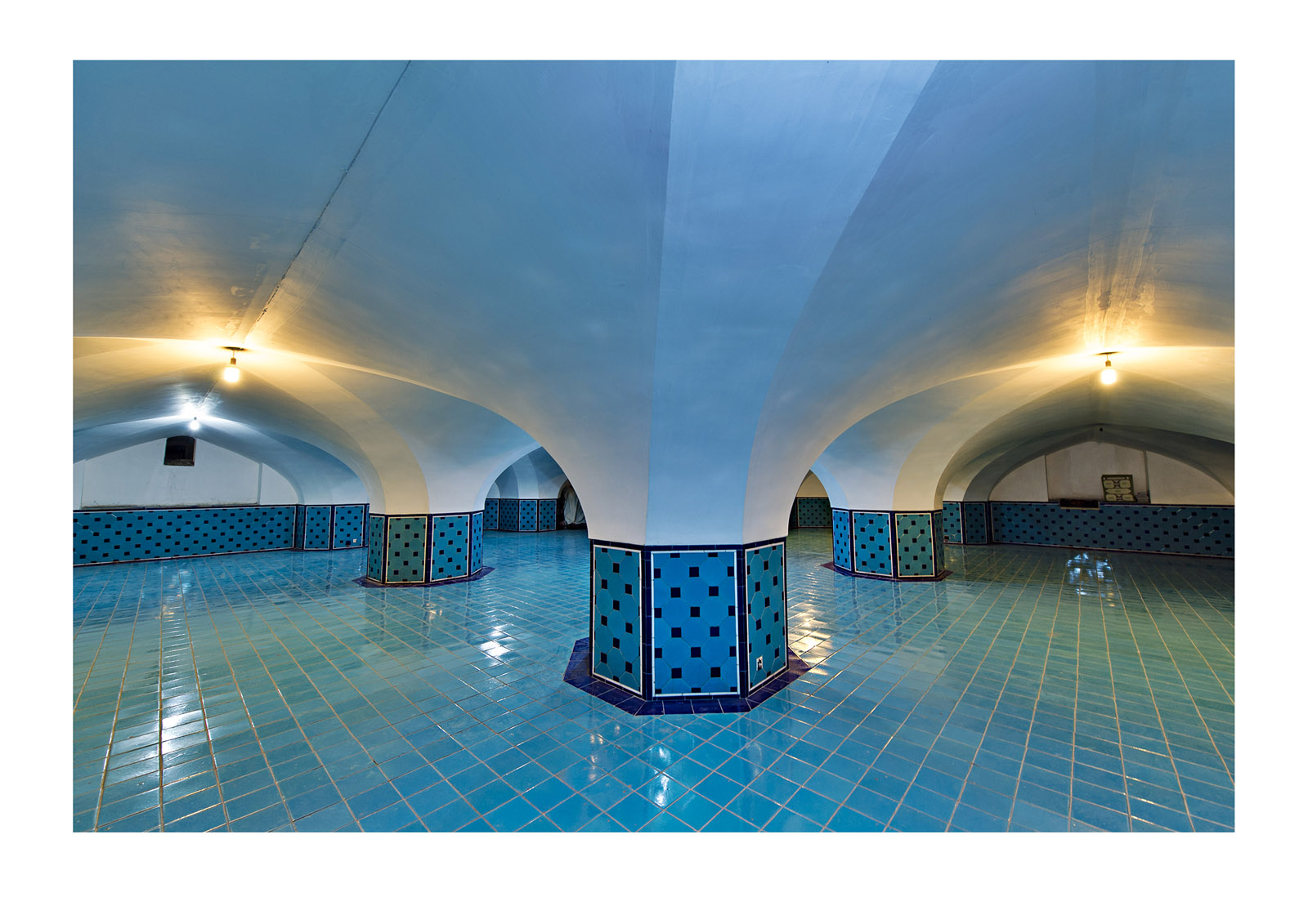 The blue tiled interior ceiling dome of an antique public bathhouse. Hammam-e khan, Yazd, Yazd Province, Islamic Republic of Iran.