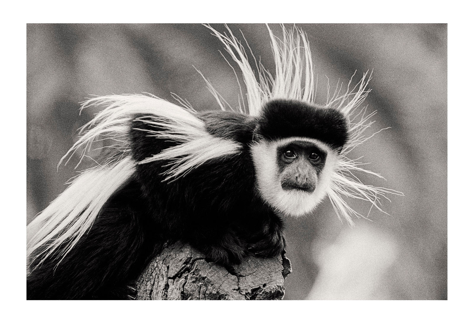 The magnificent mane of the Black and White Colobus. Captured on Ilford HP5 black and white negative film. Zoological Board of Victoria, Victoria, Australia.