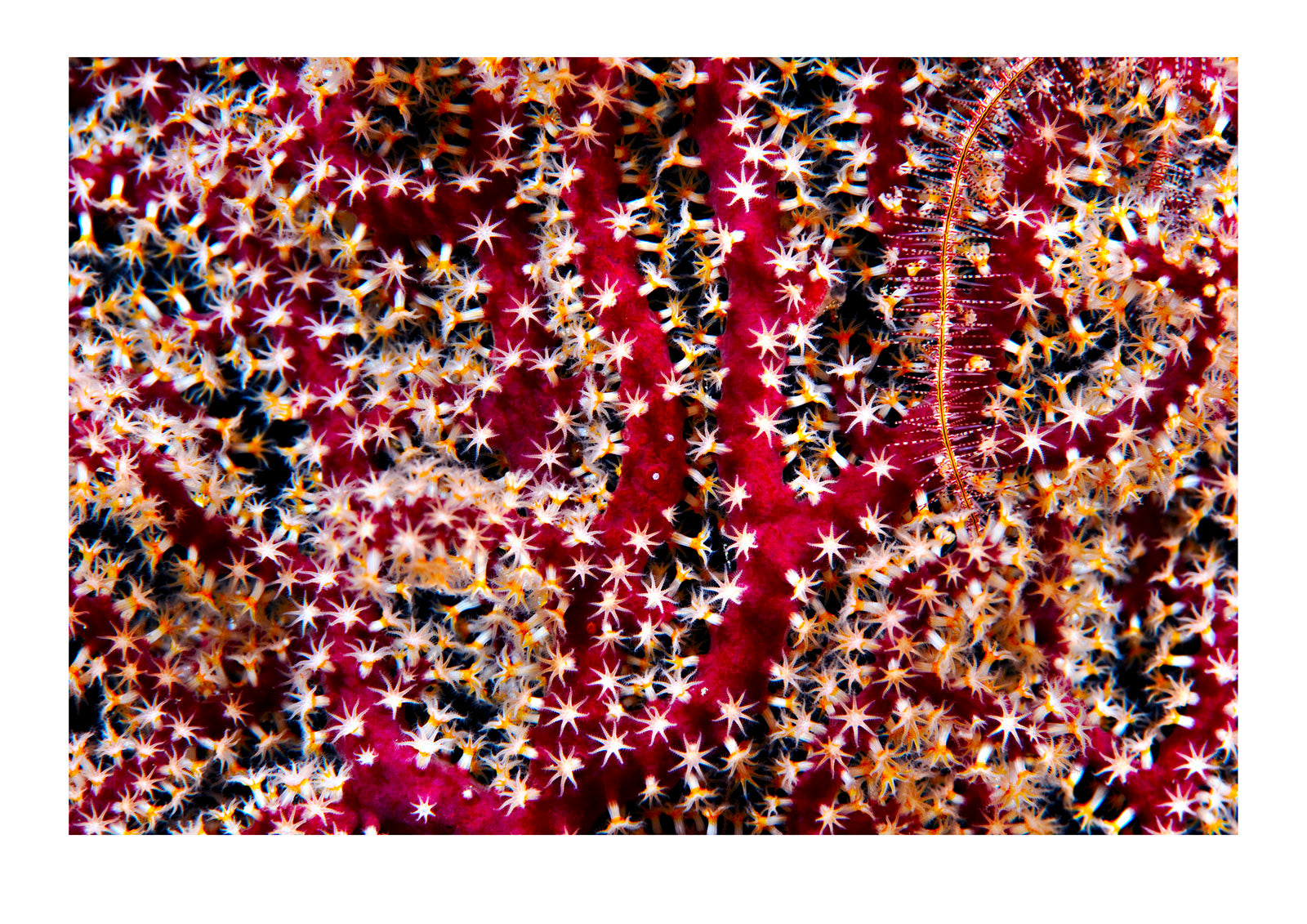 When the sun sets over a coral reef the nightshift takes over and many species too delicate to face the tropical sun emerge. The magnificent red stalks of a Gorgonian coral feeding at night with it's polyps open. Taveuni, Fiji Islands.