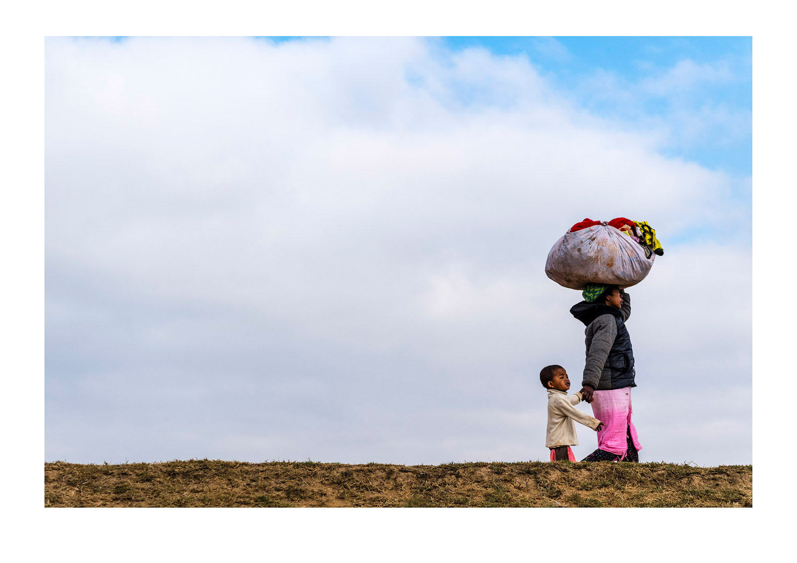 A mother carrying laundry on her head whilst leading her toddler past a brick foundry. Antananarivo, Madagascar.